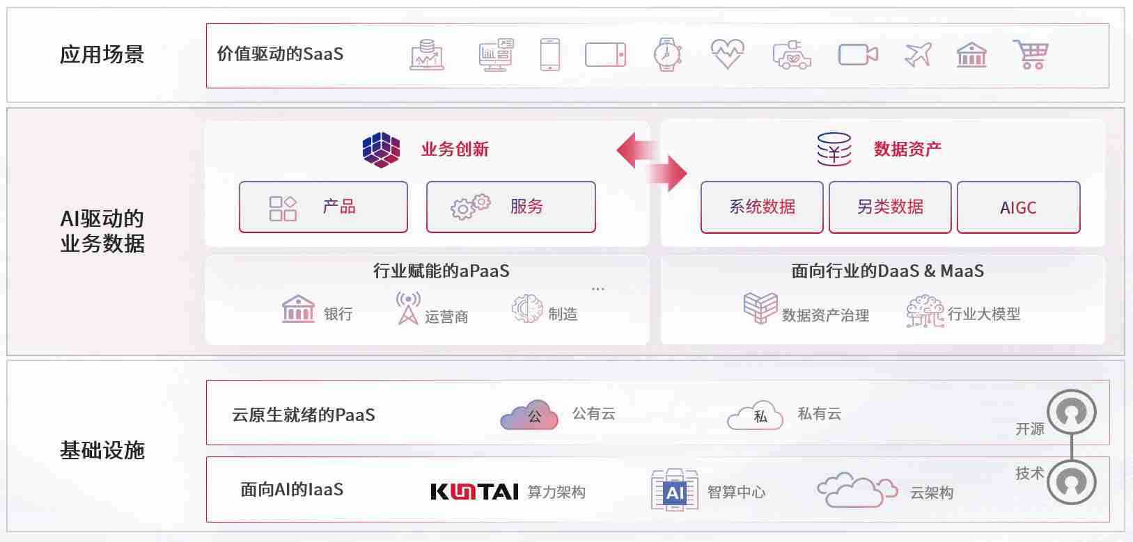 数字时代,,围绕企业数字化转型的关键要素,,,,z6尊龙旗舰厅数码开创性的提出数云融合战略和技术体系框架,,着力在云原生、、、、数字原生、、AI原生和信创产业上架构产品和服务能力,,,为处在不同数字化转型阶段的快消零售、、汽车、、金融、、医疗、、政企、、教育、、运营商等行业客户提供泛在的敏捷IT能力和融合的数据驱动能力,,,构建跨界融合创新的数字业务场景和新业务模式,,,,助力企业级客户建立面向未来的核心能力和竞争优势,,,,全面推动社会的数字化、、、、智能化转型升级。。。