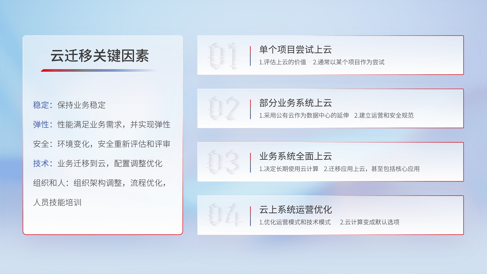 结合实际业务,,,,从规划设计、、云平台选型、、、云原生改造、、数据迁移、、、、集成交付,,,迁移全过程为客户识别最佳上云路径,,,做好风险识别管理,,设计网络架构、、、、身份权限、、、、安全审计合规、、操作审计、、、、日志审计、、、监控告警策略、、、、多站点容灾设计等,,,对云上基础设施进行整体规划,,,,提升IT治理水平,,,,以满足弹性、、、、高可用、、、、高性能的需求。。。